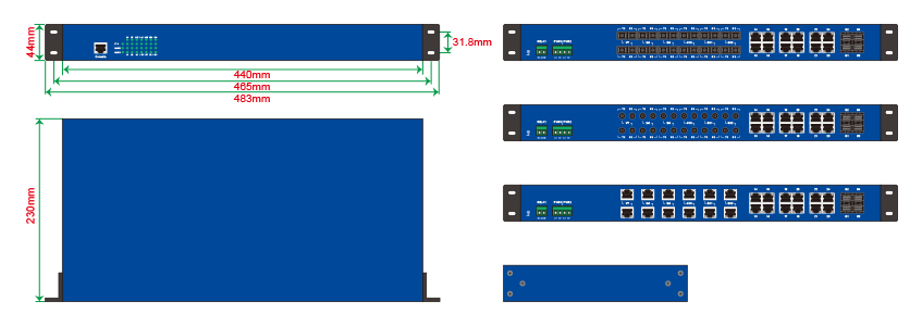 | Rya Com6128-24T-4GP | 千兆网管型机架式工业级以太网交换机,24个百兆电口,4个千兆SFP插槽,220V单电源 |